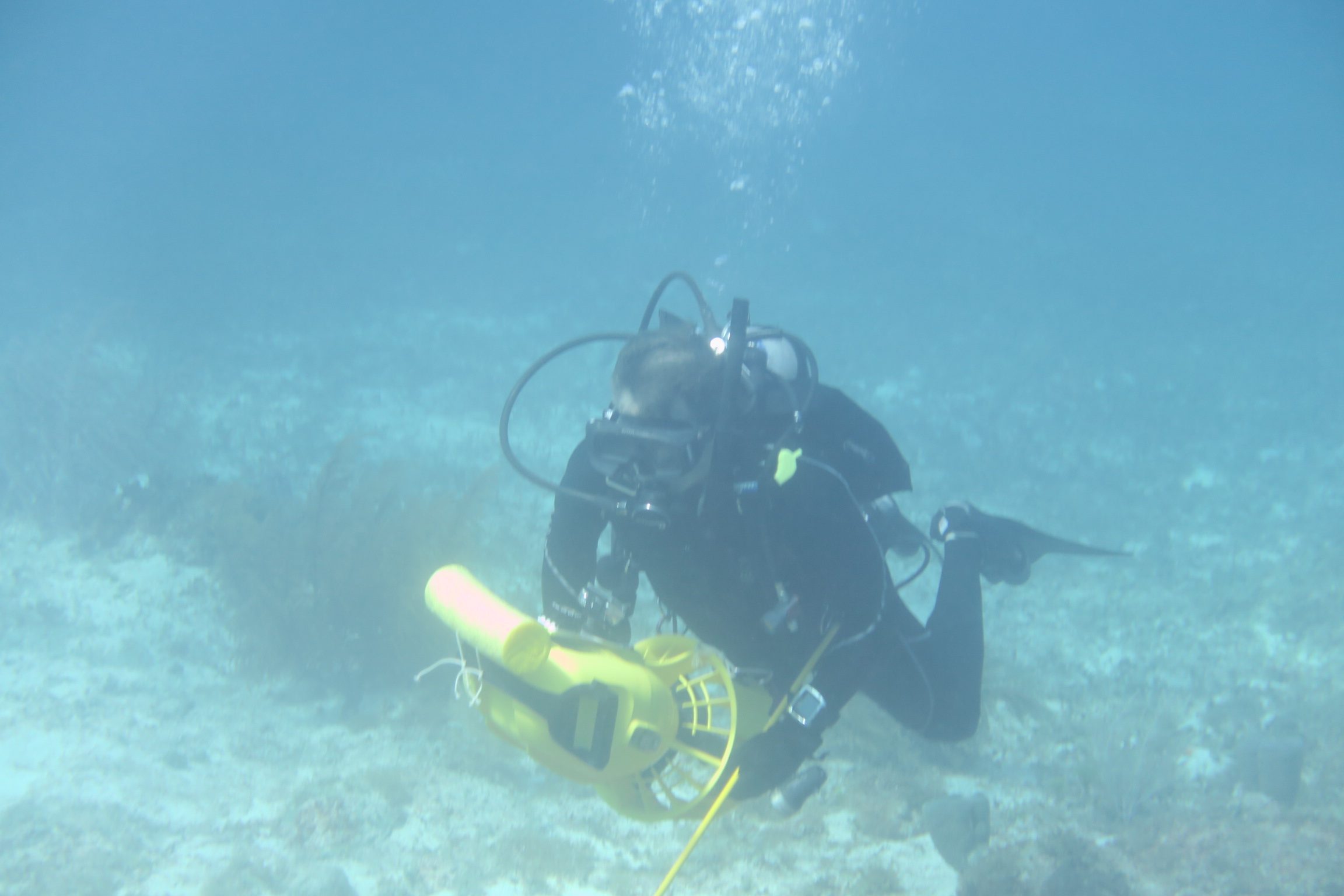 Nun raus aufs Meer. Der Boden ist sandig mit nicht so viele Korallen. Je weiter nach draussen ich schwimme, desto mehr werden es. Weiter als zu den Boyen will ich nicht, denn da düsen die ganzen Boote umher. Hier ist es auch so um die 10m tief, so kann ich schauen wie gut ich runter komme. 2 Taucher sind auch unterwegs, einer ist sogar richtig faul und hat einen Motor dabei. Nach wenigen Fotos meldet die Kamera, dass der Akku bald leer ist. Scheinbar hat die Kamera ein Problem mit der Batterianzeige, direkt nach dem Einschalten zeigt sie voll an, dann schon bald leer. Ich hätte besser den Akku getauscht am Morgen.