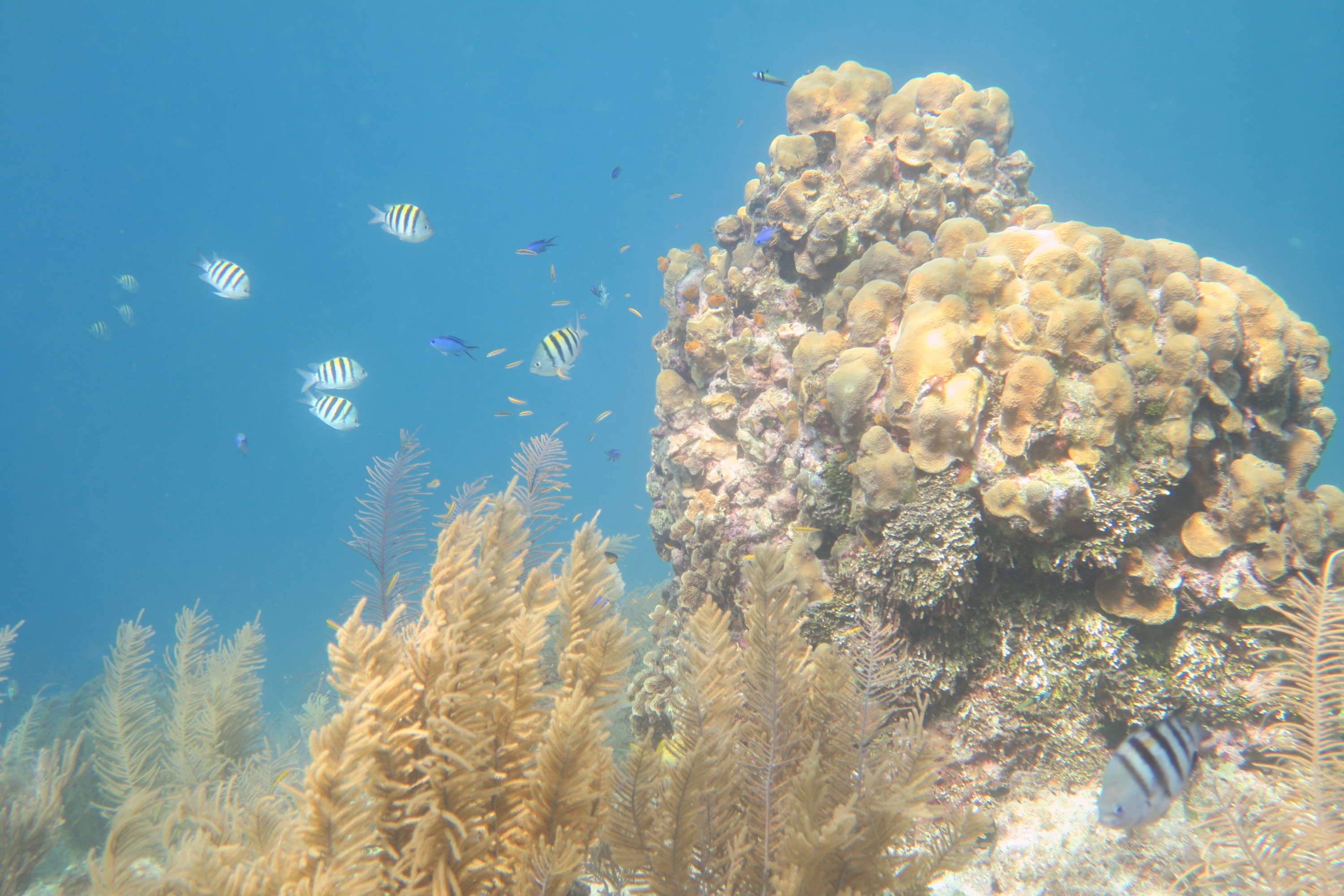 Das Wasser selbst ist, dank den fehlenden Wellen, sehr klar. Dafür ist Cozumel ja berühmt. Als Schnorchler bekomme ich ein weiteres Phänomen mit: die Oberfläche ist viel wärmer als das Meer selbst. Das ist natürlich sehr angenehm, führt aber zu einer Trüben Schicht. Häufig gibt es das genaue Gegenteil: kaltes Süsswasser schwimmt auf dem Meer.
