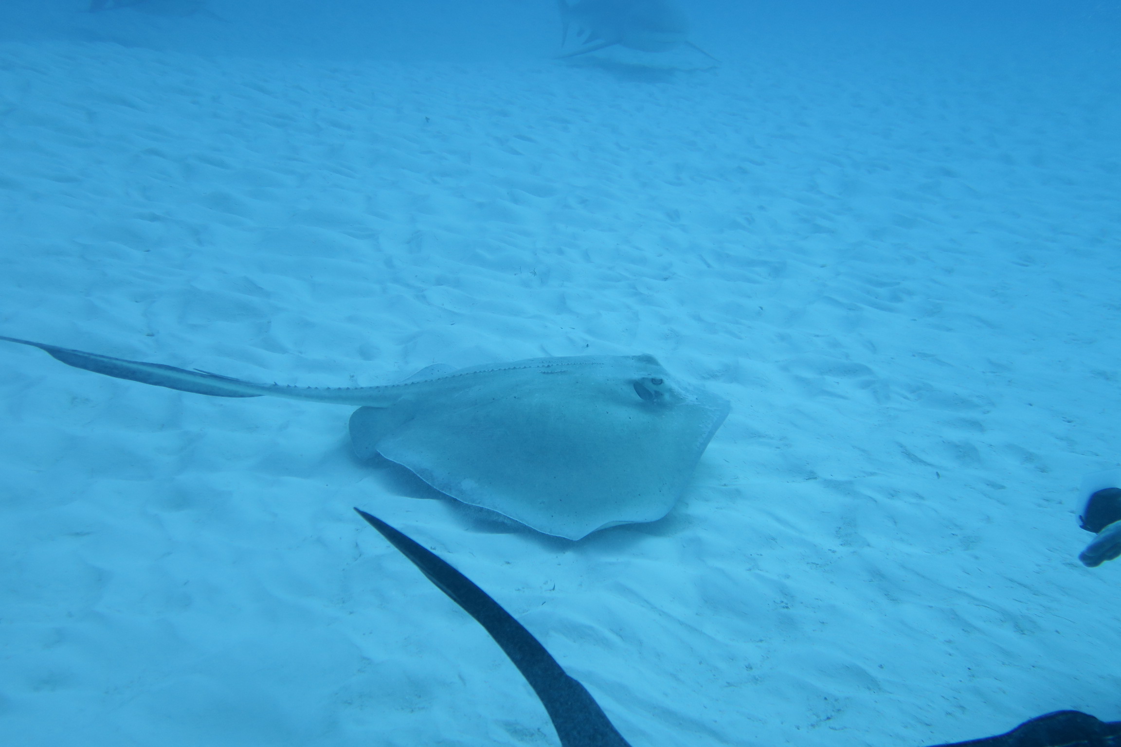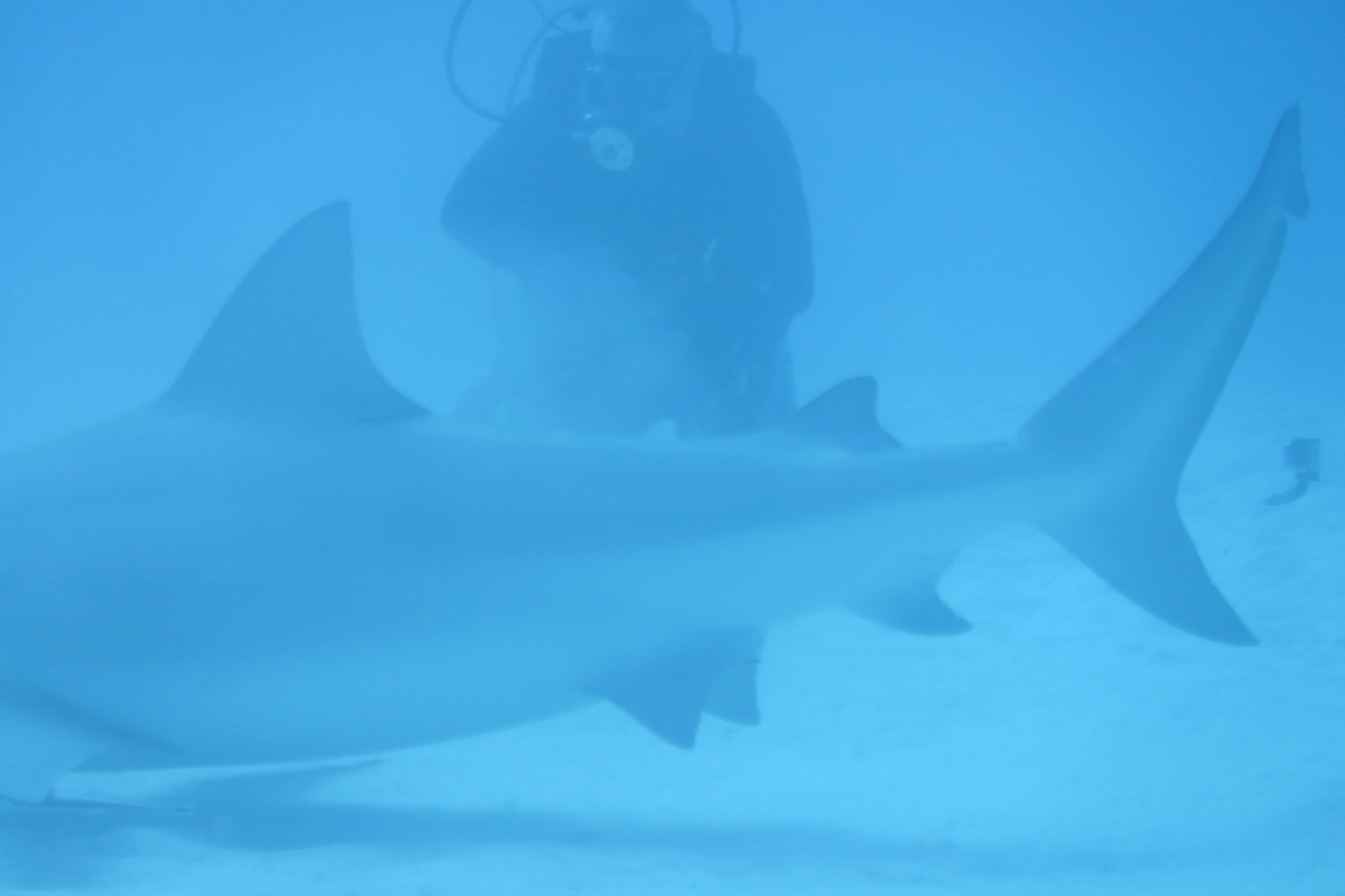 Um 8:00 treffe ich in der Tauchbasis ein, in der ich vor 7 Jahren tauchen gelernt habe. Wir bereiten alles vor und gehen dann an den Strand zum Boot. Ein paar Kilometer vor der Küste in etwa 30m Tiefe schwimmen die Haifische. So 100% weg ist meine Erkältung noch nicht, das Salzwasser hilft aber und befreit die Nase. Druckausgleich geht auch sehr gut, das habe ich in Cozumel schon probiert. Der Fuss ist nun immerhin wasserdicht, auch wenn die Haut noch dünn ist und geschützt weden muss.Die 30m bin ich mit der Gruppe schnell unten. Der Chef hat eine neue Taktik um die Haie anzulocken: er füttert die kleinen Fische um sie anzulocken. Die wiederum ziehen die Haie an. Es dauert nicht lange bis die ersten Bullenhaie um uns kreisen. Teilweise kommen sie auf etwa einen Meter Abstand. Das reicht mir völlig, Körperkontakt wie mit den Mantarochen möchte ich hier lieber vermeiden. Haie haben mir zu lange Zähne dafür. Die Bullhaie sind nach den weissen Haien auch die gefährlichsten. Aber zu Tauchern sind sie ganz lieb. Ein Stachelrochen will auch noch vor die Kameras.