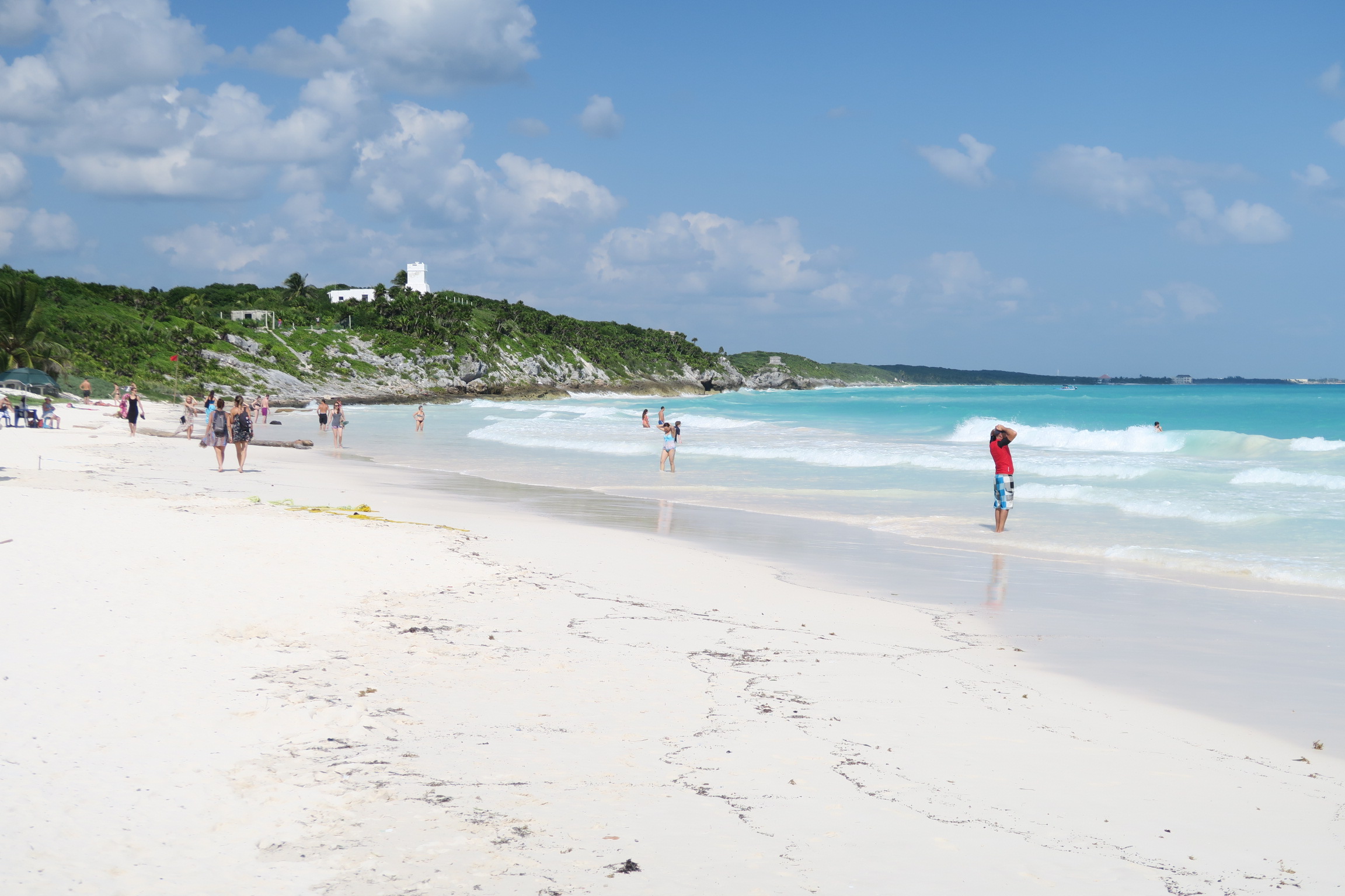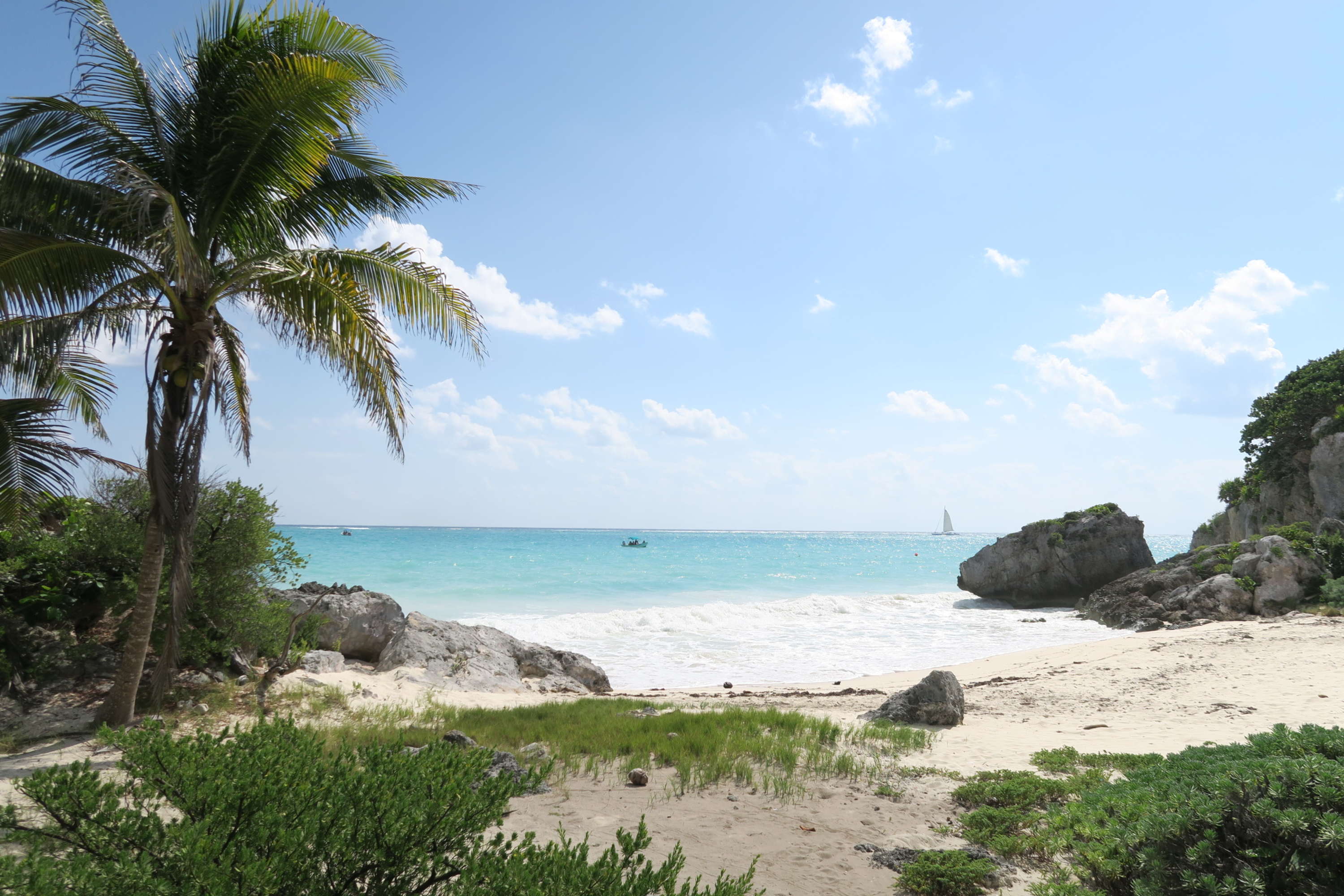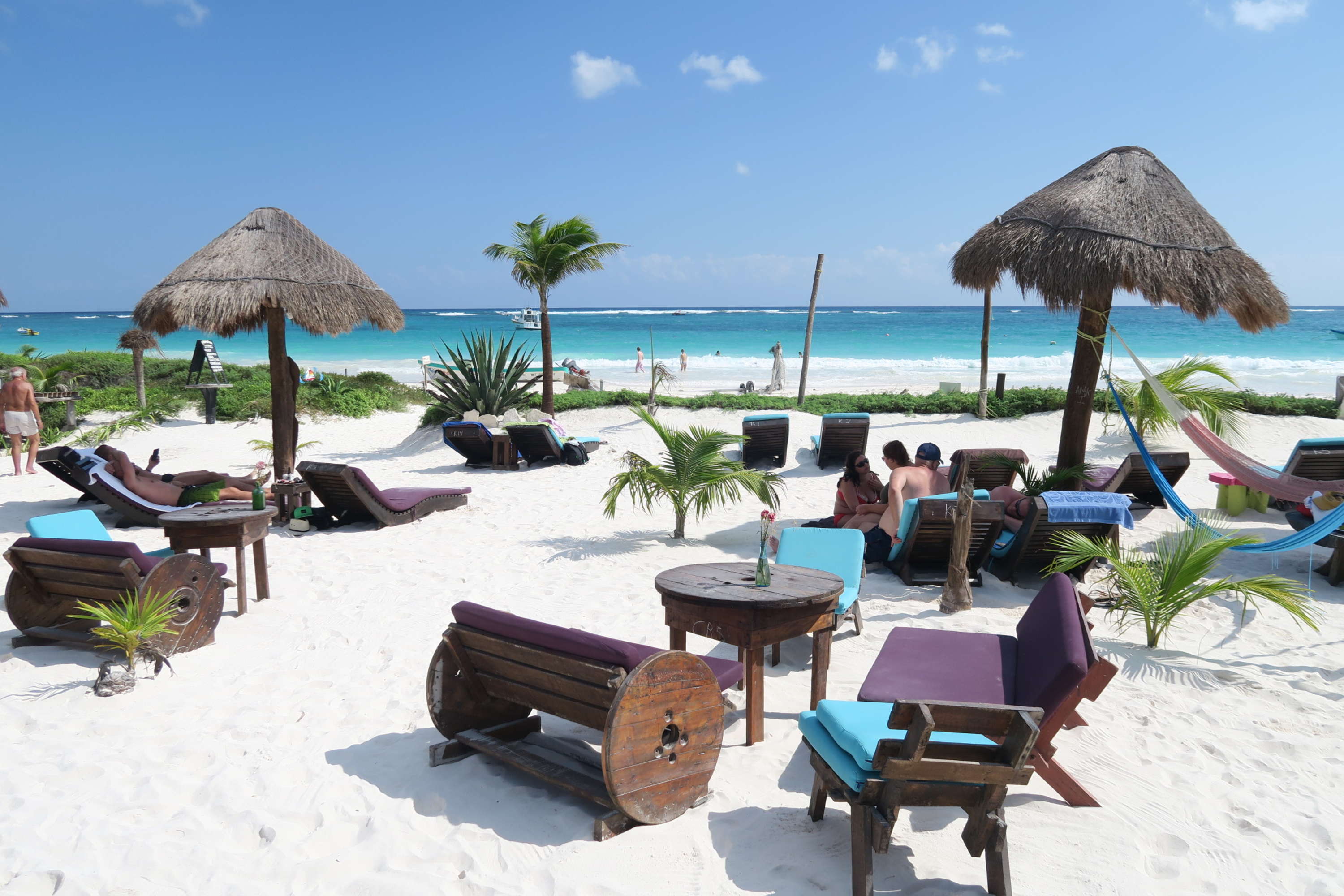 Dorthin will ich als nächstes: der berühmte Strand von Tulum. Mal schauen ob der auch so überbaut wurde wie in Playa. Mit angenehmer Überraschung zeigt sich der Strand immer noch recht natürlich. Einige Restaurants gibt es zwar, aber das ist gut für mich, denn ich habe hunger.
