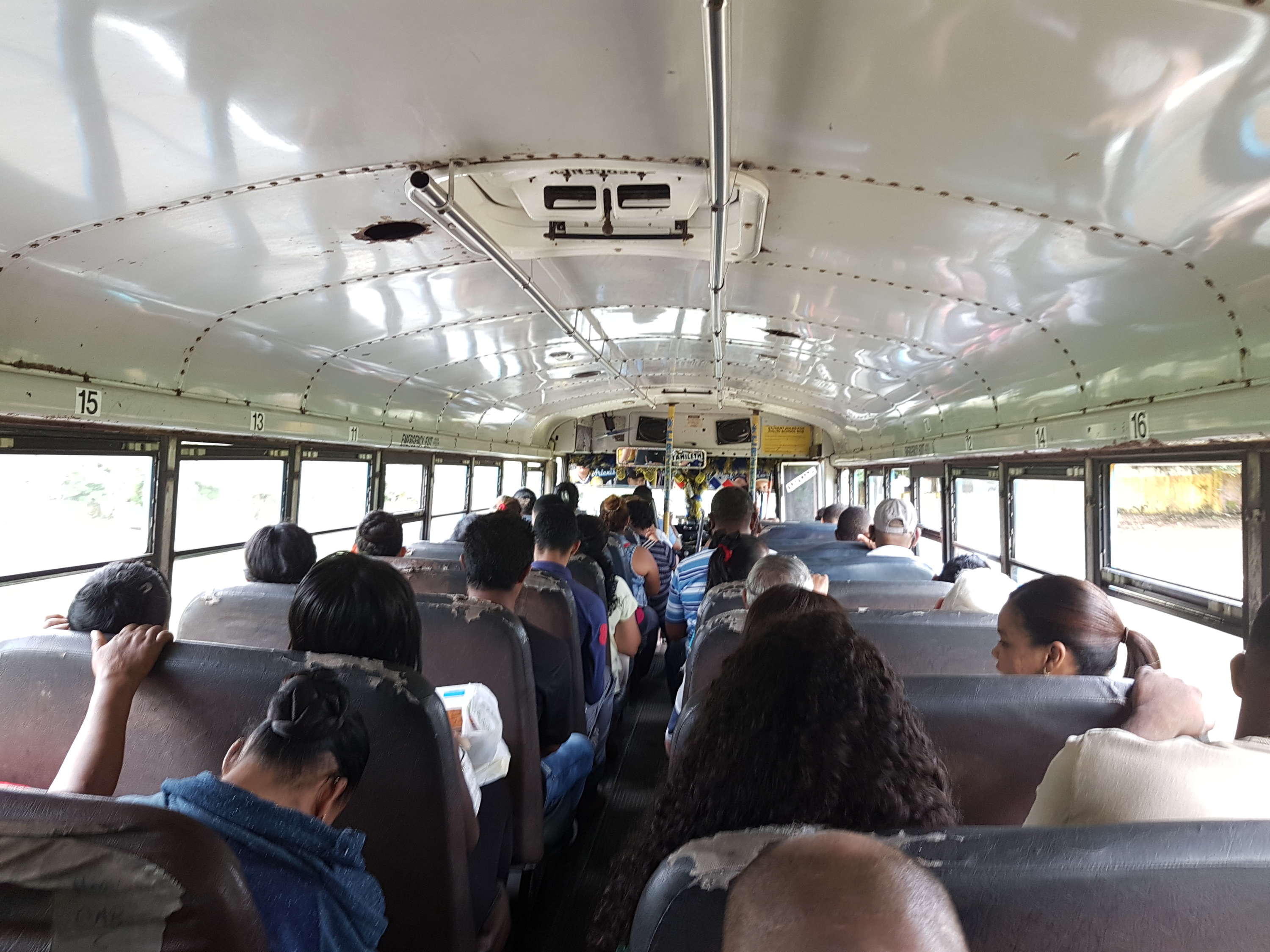 Der 2. Bus ist nun sehr typisch für diese Gegend, ein alter, amerikanischer Schulbus. Fast komplett original, ausser mit rasantem Anstrich aussen. Weil die grossen Rucksäcke hinten rein kommen, steige ich auch gleich hinten ein. Die Sitze hier sind “Schleudersitze”, denn die Hinterachse ist fast in der Mitte des Buses und verstärkt jede Unebenheit.