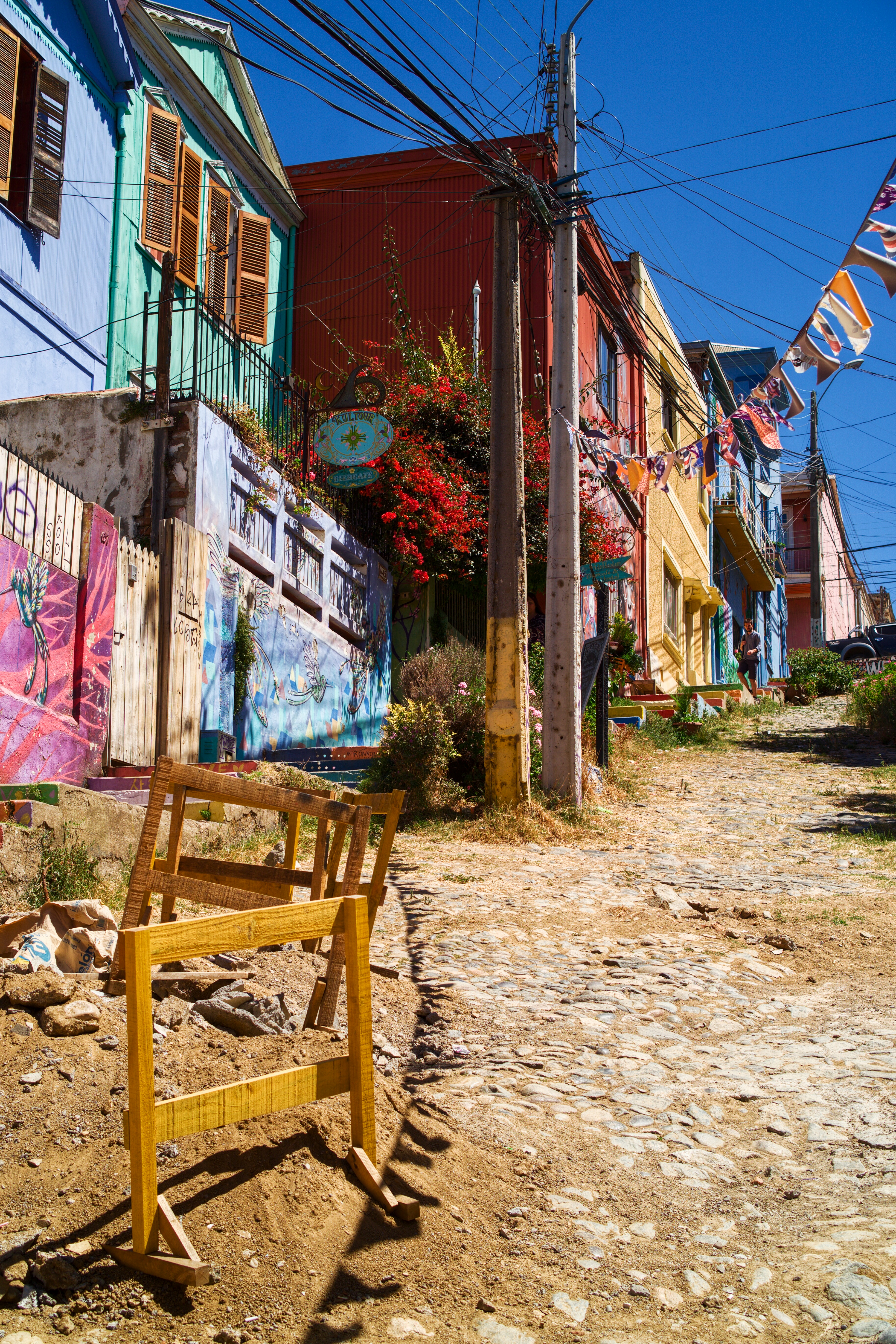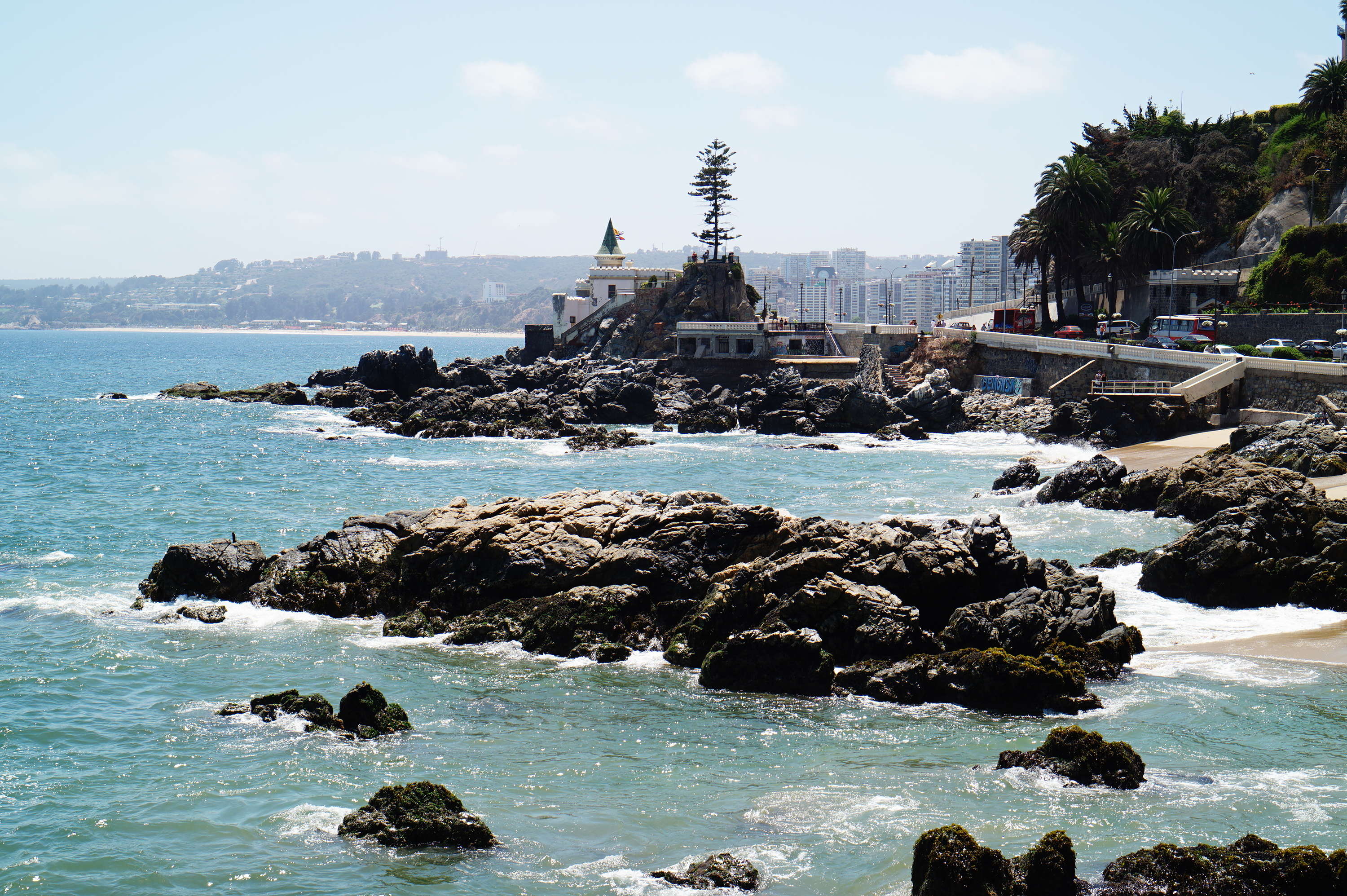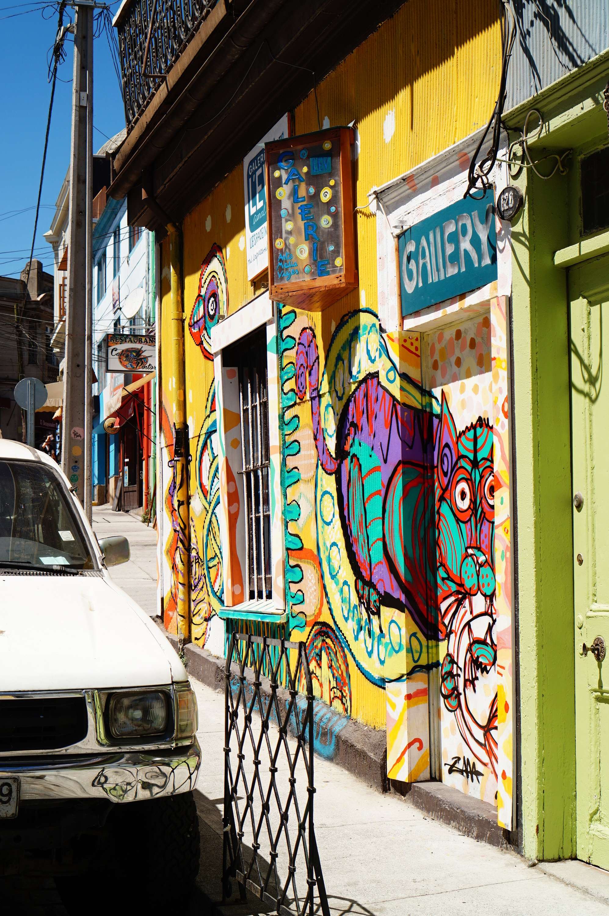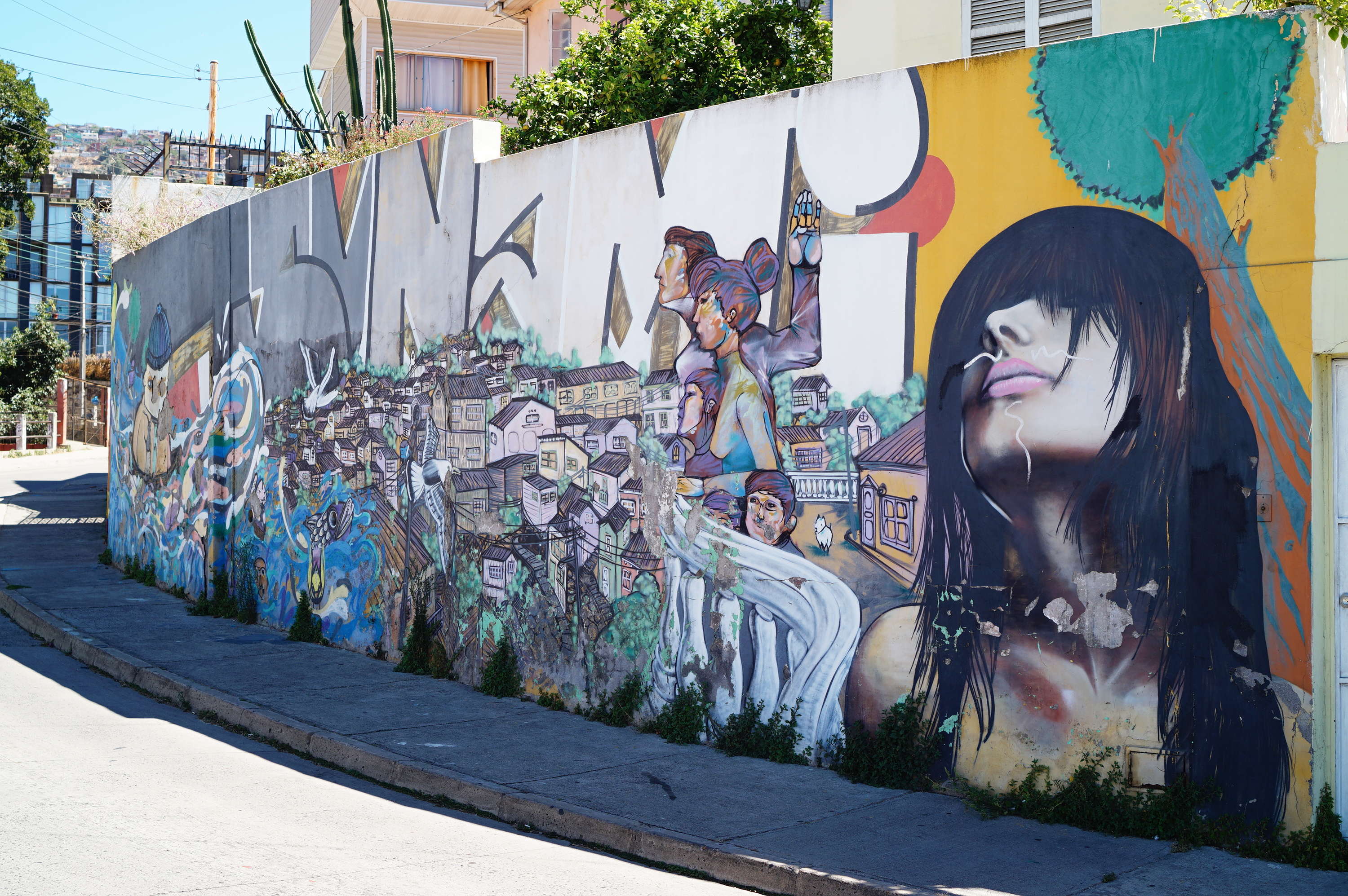 Die Stadt ist sehr spannend mit ganz vielen Graffitis überall. In fast jeder Strasse hat es schön bemalte Häuser mit vielen Fotogelegenheiten. Etwas weniger gefällt mir der Wind, der bläst mir einfach den Stadtplan aus den Händen über eine Mauer. Naja, ist egal, denn in einer Stadt am Hügel und am Meer kann man sich kaum verlaufen. Das Ufer finde ich schnell.