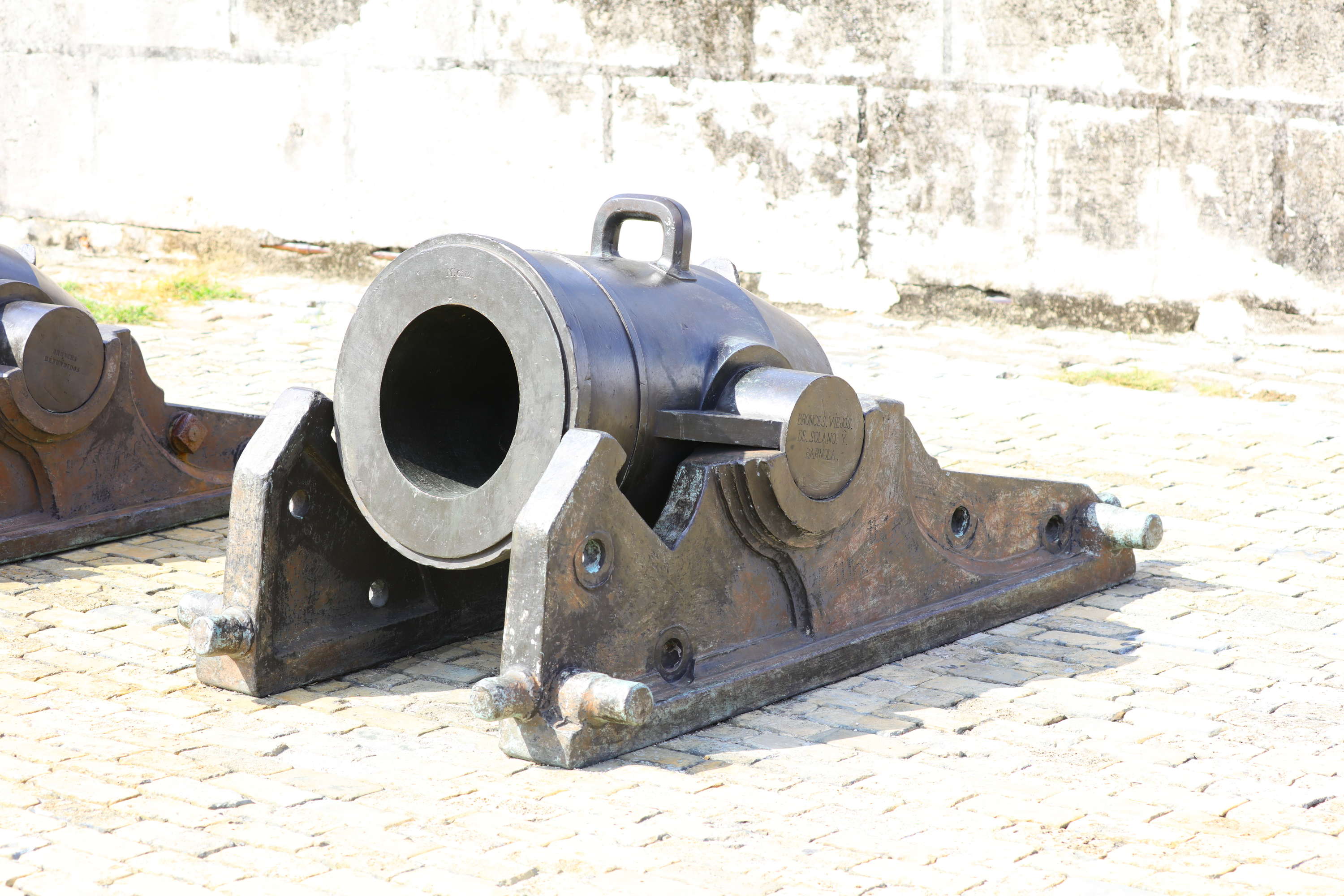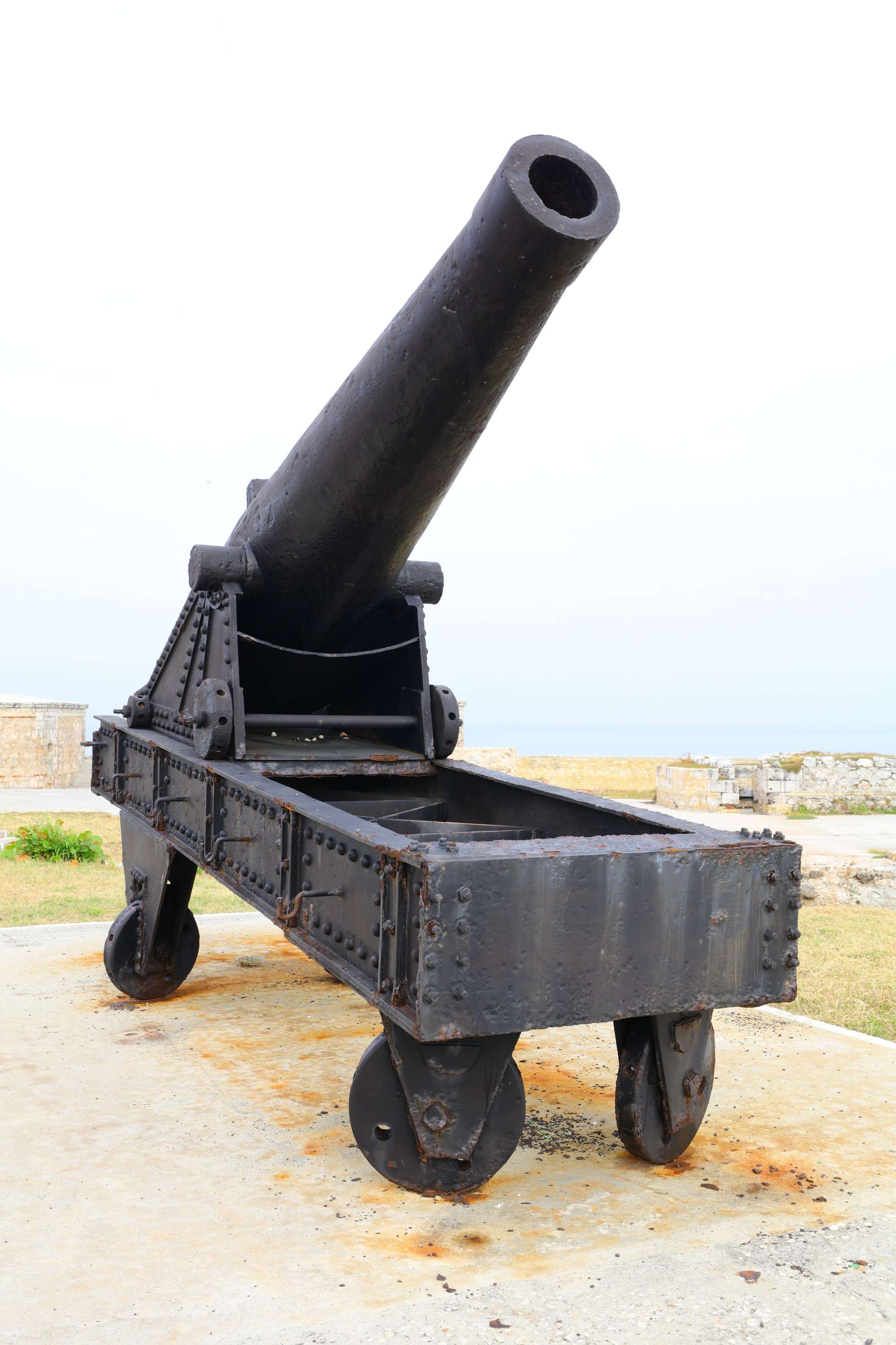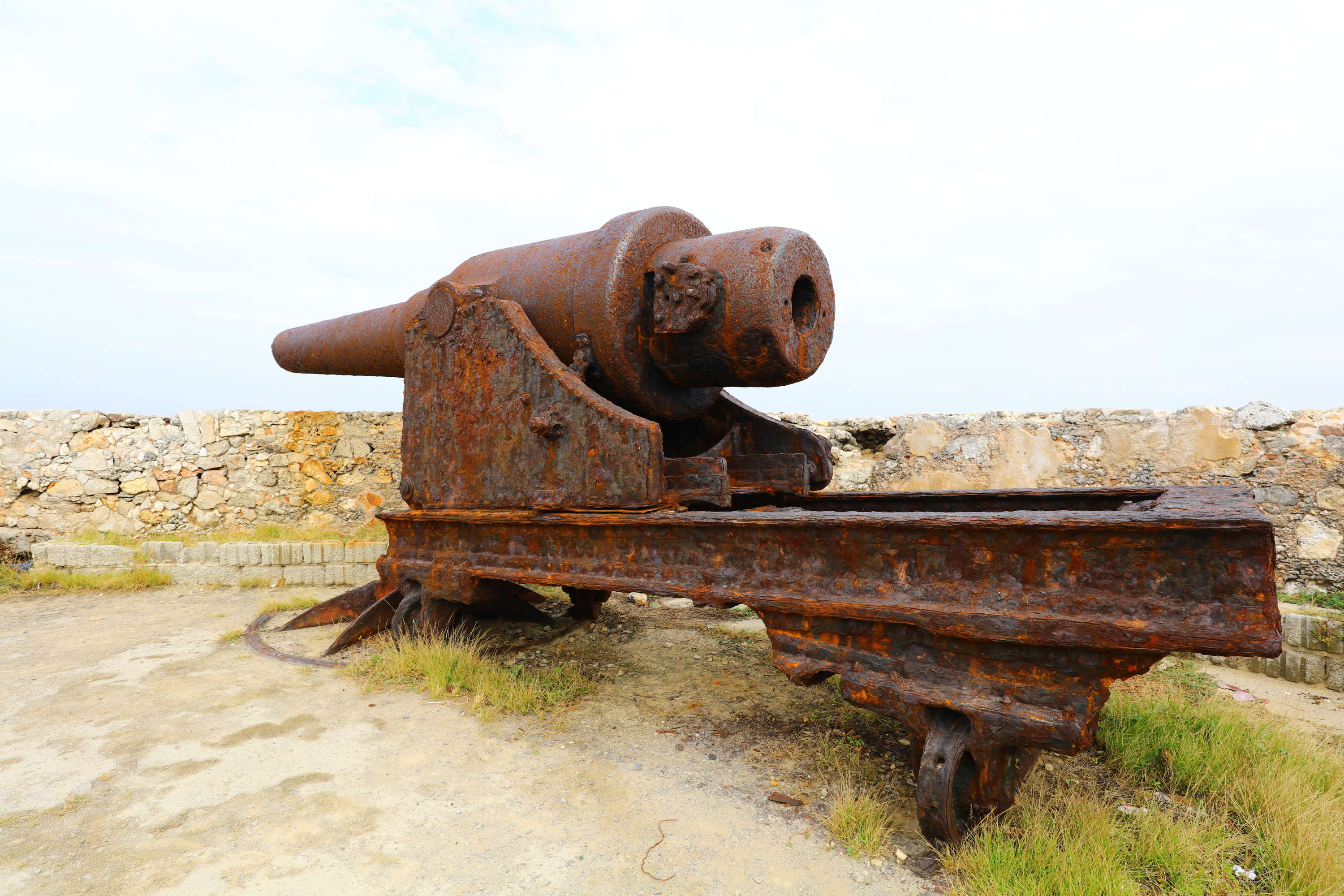 Direkt am Meer gibt es eine schöne Aussicht und ganz viele alte Kanonen, die neusten sind vielleicht von 1900 mit ziemlich grossem Kaliber. Sie waren gedacht zur Verteidigung gegen die Engländer und rosten seit langer Zeit vor sich hin. Zentimeterdicke Platten sind komplett durchgerostet. Teilweise wurden sie vor langer Zeit renoviert, also der Rost abgeschlagen und mit Rostschutz bestrichen. Man sieht die Dellen vom Rost vor der Renovation und man sieht wie der Rost bei den Löchern im Rostschutz wieder mehrere Zentimeter tief geht. Ist wirklich krass, man kann sich kaum vorstellen, dass so riesige Mengen Stahl sich in Stein verwandeln können.
