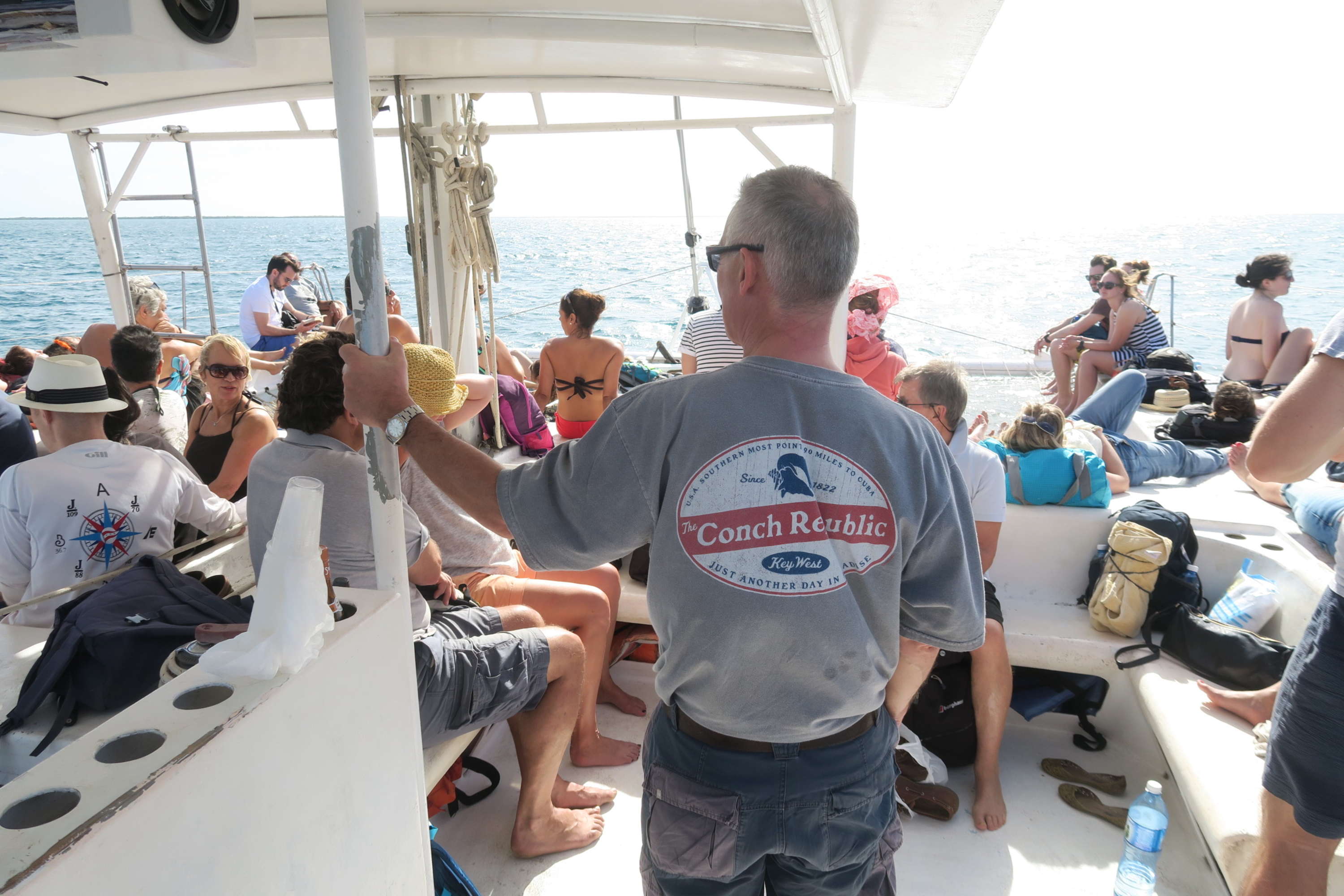Auf dem heutigen Programmpunkt steht ein Segelkatamaranausflug zu einem schönen Strand mit Schnorchelriff und Essen und Gereänk inklusive. Das tönt doch schon ganz gut! Nur fängt das Ganze weniger gemütlich an, der Katamaran ist zwar riesig, aber auch gewaltig überfüllt. Unsere Vorstellung war eigentlich, dass unsere 16er Gruppe einen eigenen bekommt.