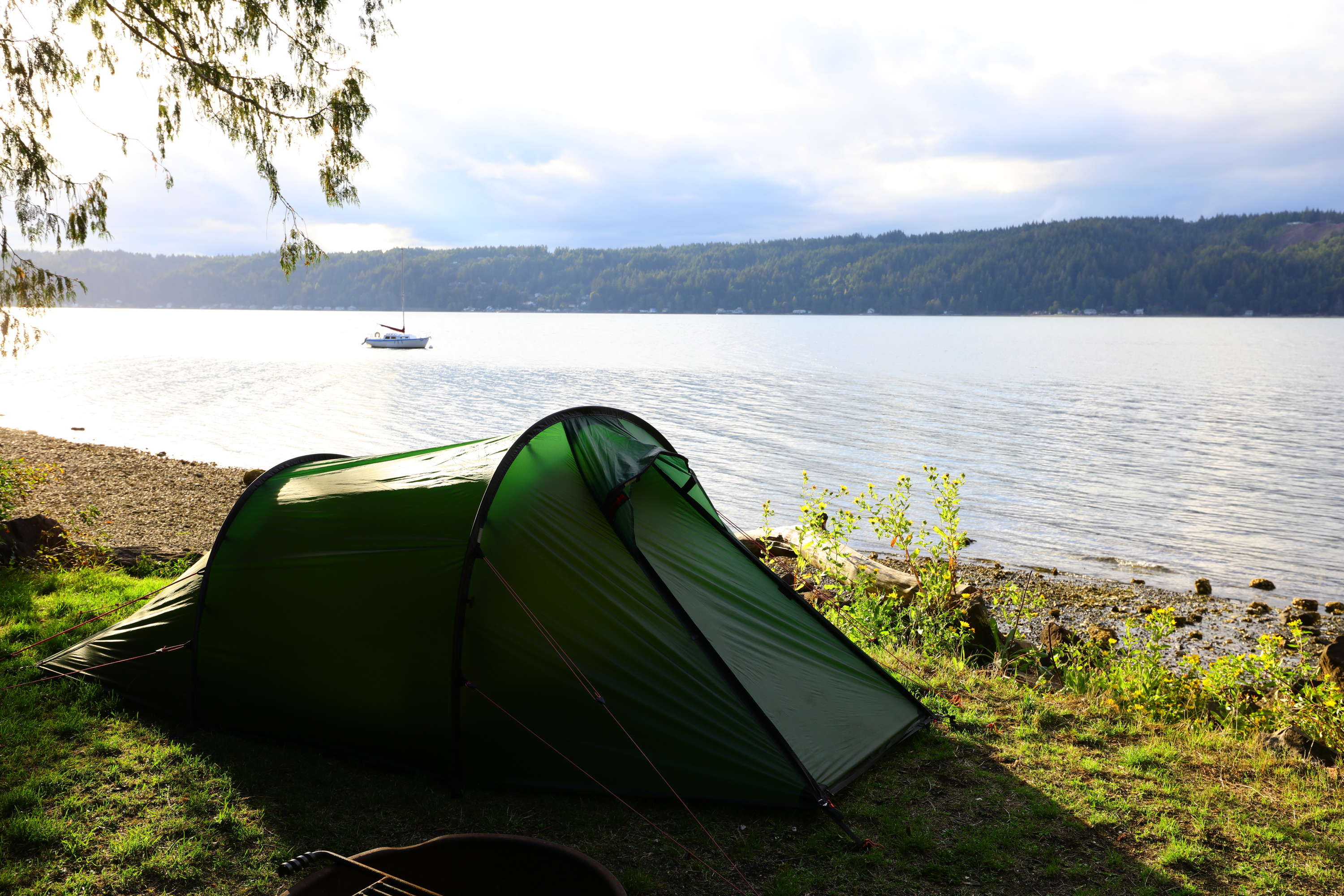 Auch nass ist das Zelt schnell zusammengepackt und schon geht’s los dem Meeresarm entlang mit den Olympischen Bergen im Hintergrund. Jetzt ist die Strasse sogar öfters am Wasser. So wie es aussieht, war die Entscheidung zu campieren ganz gut, ich sehe jedenfalls weit und breit kein Hotel.