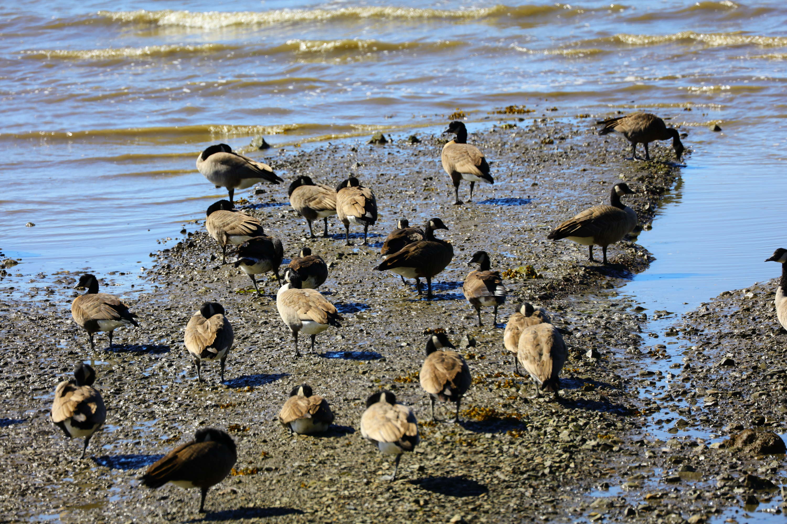 Am Nachmittag fahre ich auch einem Wildreservat entlang und sehe auch grosse und kleine Tiere: Raupen versuchen die Strasse zu überqueren und schaffen es hoffentlich auch. Einige Libellen waren da weniger erfolgreich, wie die Überreste auf dem Velostreifen zugen. Direkt nach meinem Mittagessen überquert auch ein Schwarzbär gemütlich die Strasse und wird um einiges schneller als das Auto anrollt. Auch ganz viele Vögel suchen im Schlamm ihr Mittagessen, aber erst bei den Wildgänsen beschliesse ich auf das Teleobjektiv zu wechseln. Vorher waren Enten und andere Vögel am Werk.