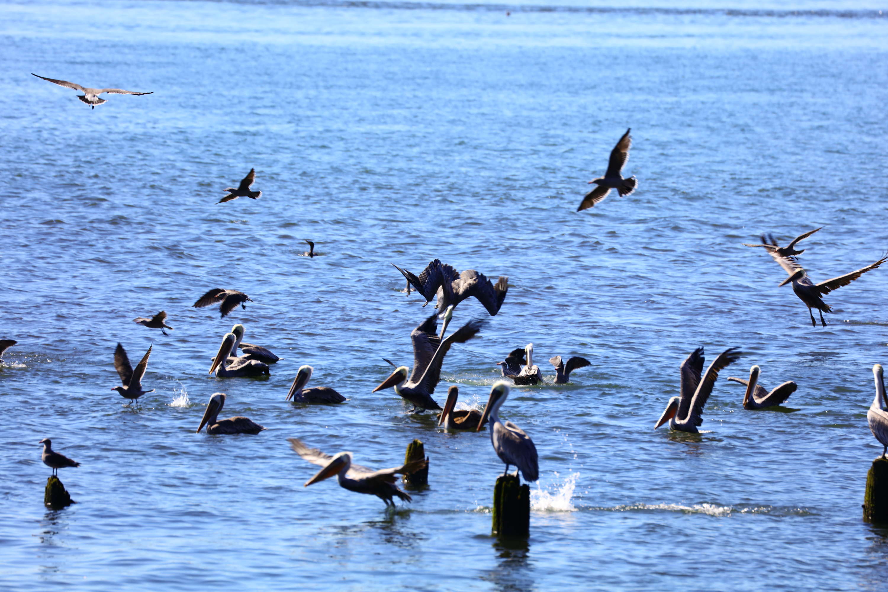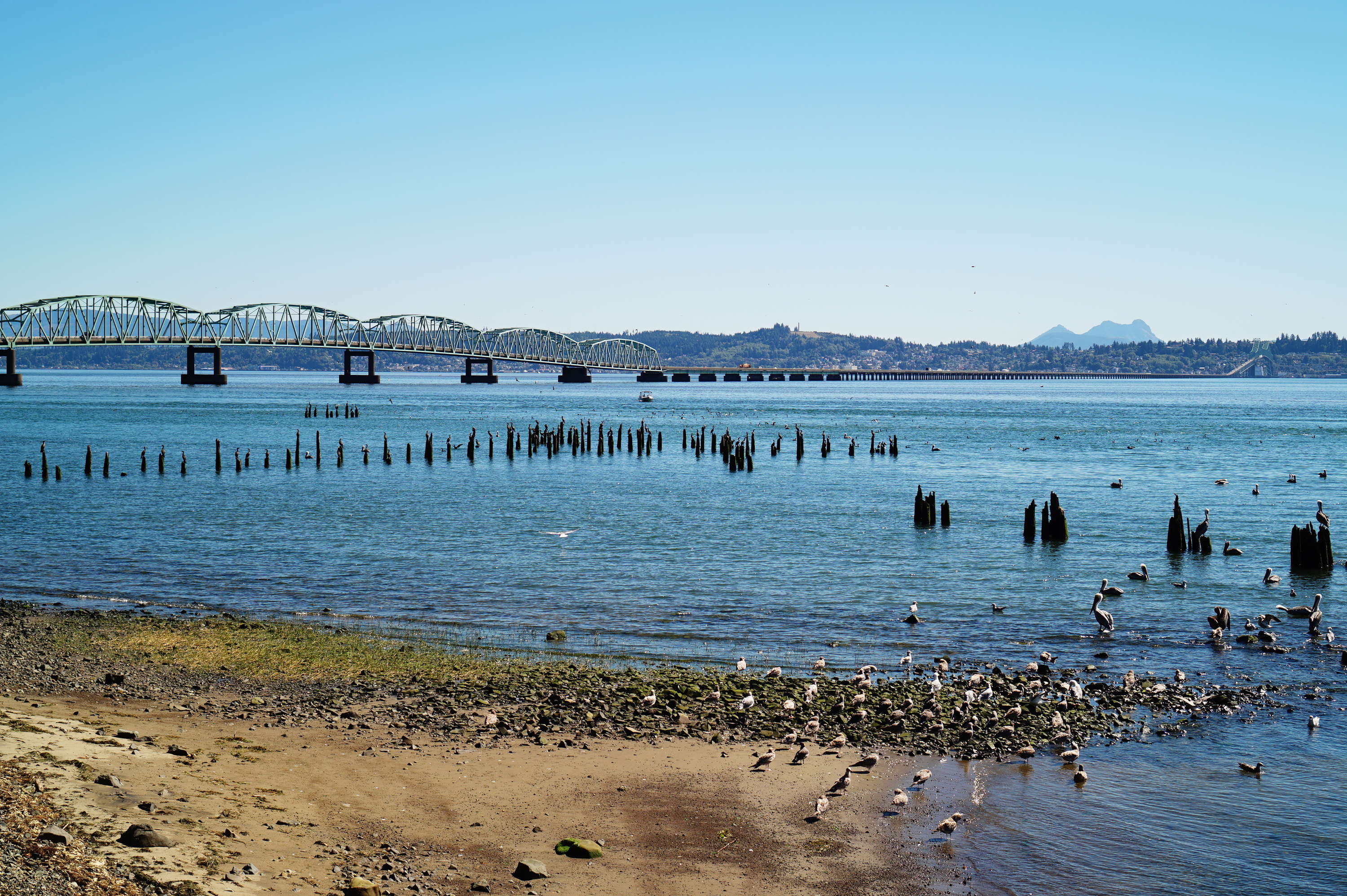 Meine Stunden im Staat Washington sind gezählt als ich mich der riesig langen Brücke von Astoria über den Colombia River mit seiner roten Färbung nähere. Zuvor halte ich noch kurz und kann gleich ein Spektakel miterleben. Ein Schwarm Pelikane ist am fischen und stürzt sich immer wieder im Sturzflug ins Wasser. Die Brücke ist 6km lang und steigt am Ende steil auf und um Glück gibt es für mich einen dünnen Radstreifen. Weniger Glück hatten über ein Dutzend Vögel und nahmen ein jähes Ende in einer Windschutzscheibe. Das Resultat davon liegt über die ganze Brücke auf meinem Velostreifen verteilt.