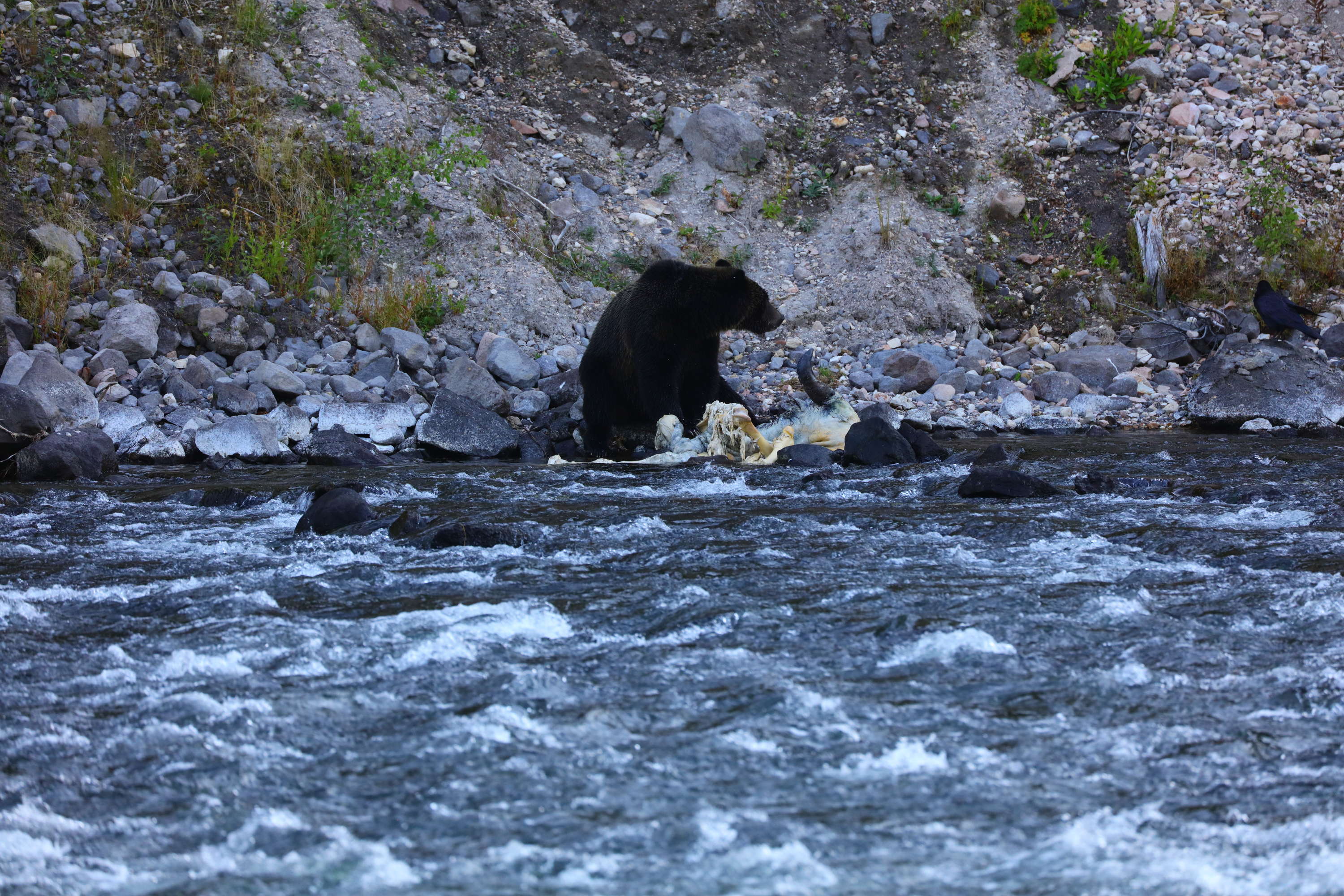 Ganz so gut habe ich unter dem Sternenhimmel nicht geschlafen, ganz zur Freude der Reisegefährten bin ich schon um 7:00 wach und wir können den Tag früh beginnen. Beim packen merke ich, wie trocken alles ist: der feine Staub setzt sich überall an. Auch die Luftfeuchtigkeit ist sehr tief mit etwa 20%. An einem unscheinbaren Fluss mit Stromschnellen halten wir an und landen gleich einen Volltreffer: am anderen Ufer nagt ein Grizzlybär an den Überresten eines Büffels. Schade ist nur, dass der Bär schwarz und im Schatten ist. Jetzt hat es sich definitiv gelohnt, das schwere Teleobjektiv mitzunehmen. Später läuft uns nochmals ein Bison vor die Linse. Irgendwie bin ich die ganze Zeit am Kamera und Objektiv wechseln, da es hier so viele Fotogelegenheiten gibt. Und auch die Speicherkarten füllen sich, aber zum Glück nur ganz langsam.