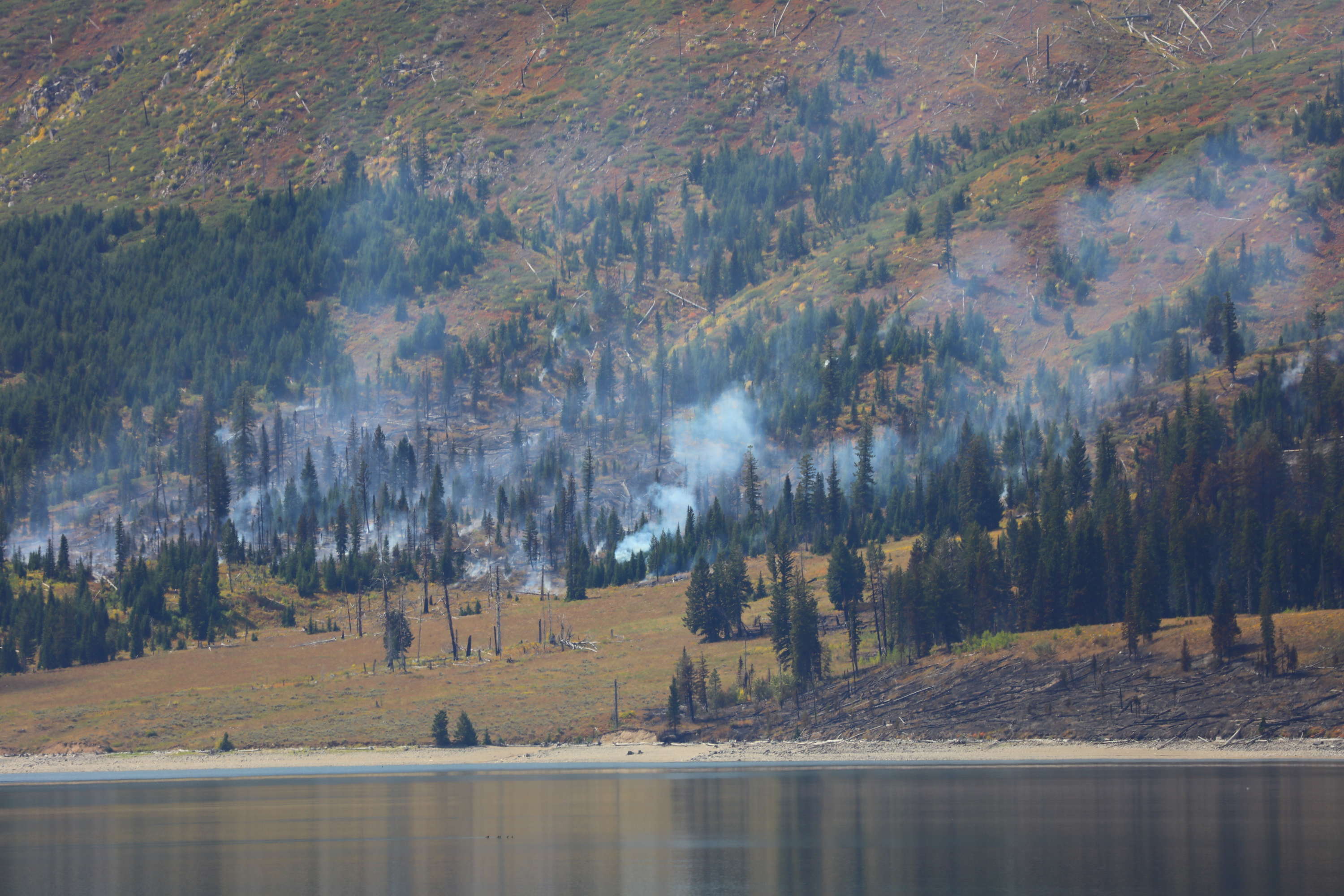 Auch bei der Mittagspause geht es heiss weiter: im Grand Teton Nationalpark brennt auch der Wald gleich am anderen Seeufer.