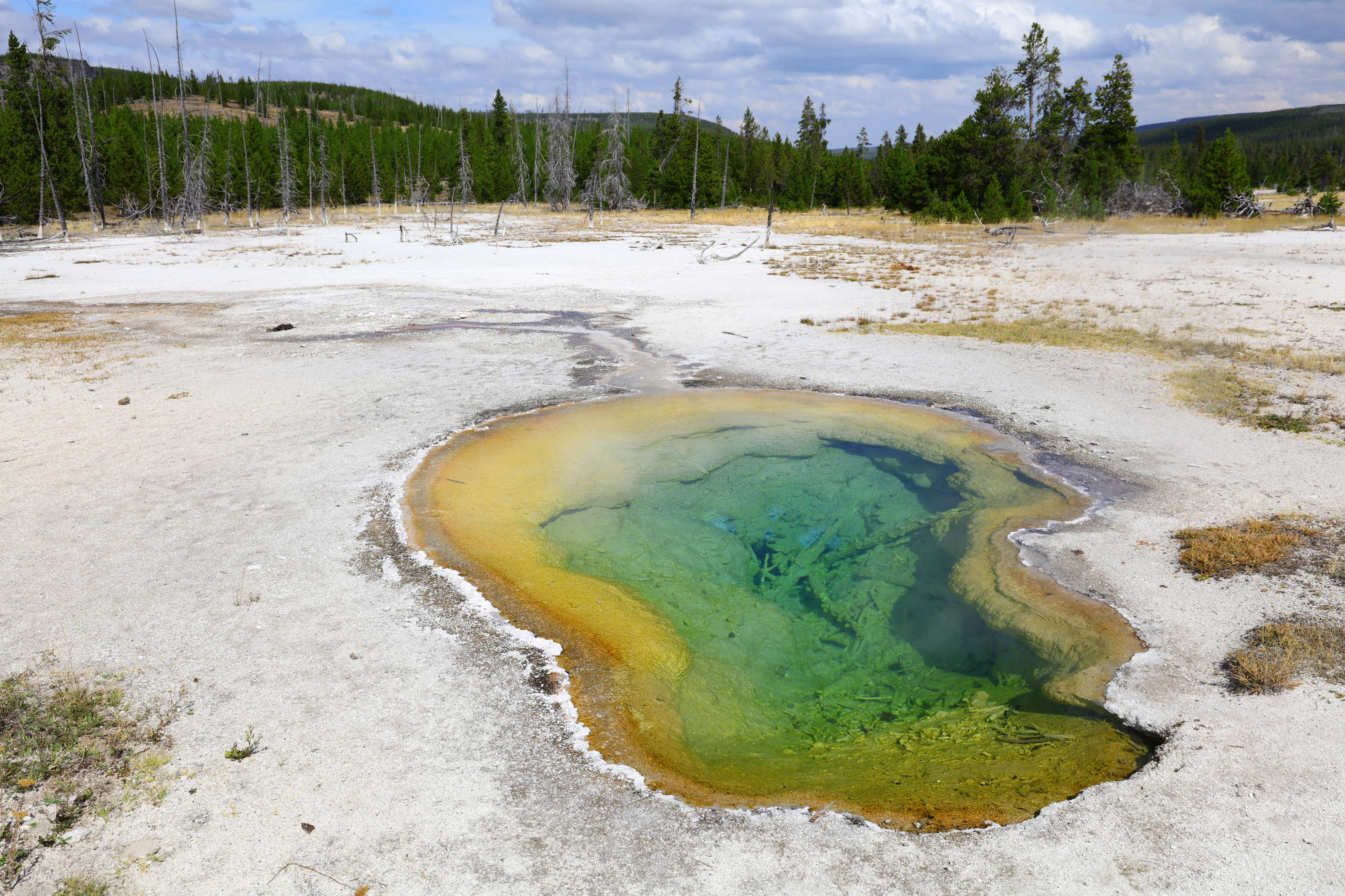 Der obligatorische Besuch beim Old Faithful machen wir und hunderte andere Touristen gegen Mittag. Auch bei den anderen Sprudelbecken sind wir nicht ganz die Einzigen, was auch der Stau zu den Pakplätzen vermuten lässt. Mit der Zeit kommt leider immer mehr Bewölkung auf, welche die Sonne verdeckt und damit den Becken all die schönen Farben raubt.