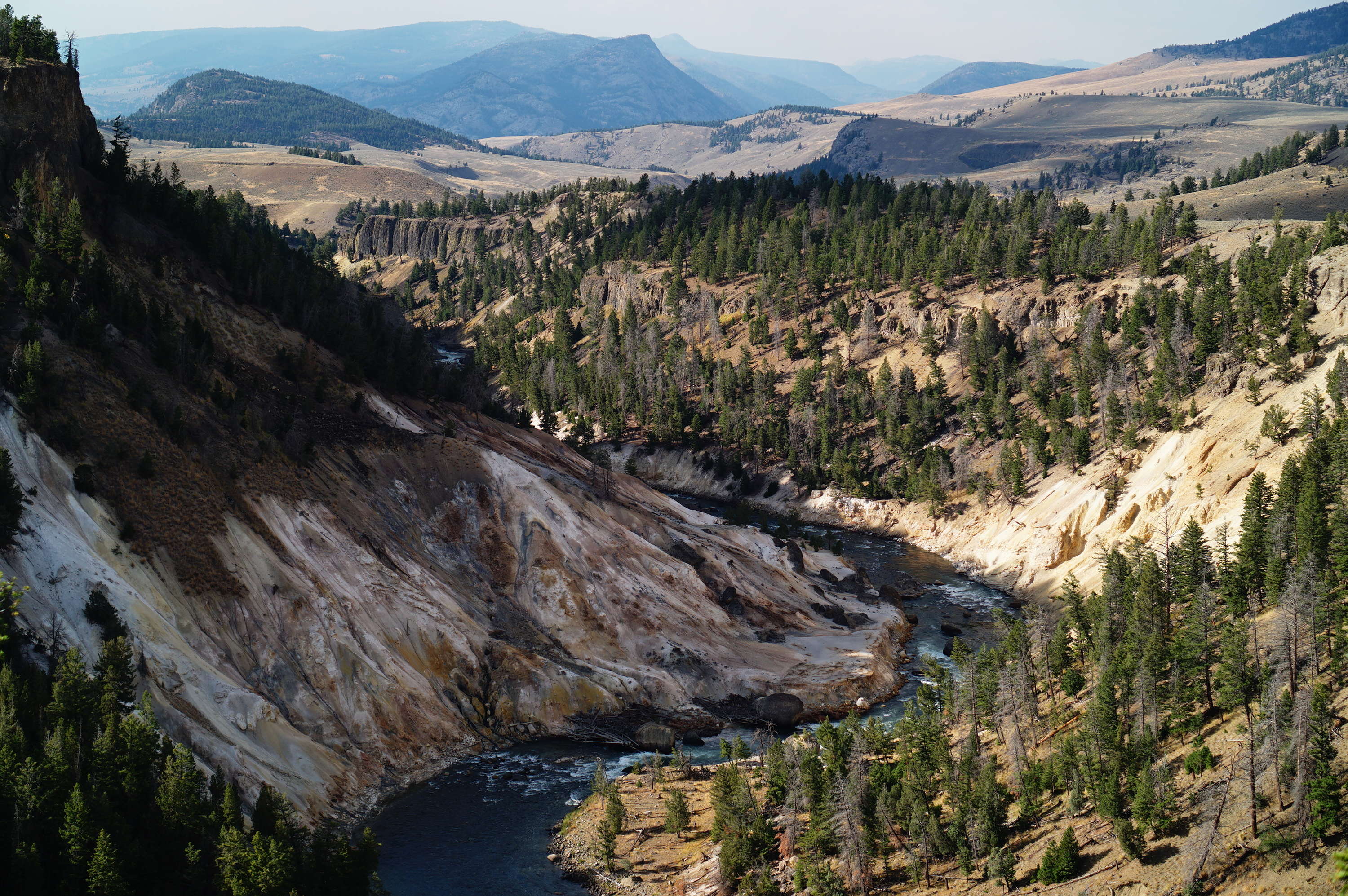 Nach einem gemütlichen Frühstück machen wir uns auf den Weg durch die endlosen Weiten um in den Yellowstone Nationalpark zu gelangen. Das Mobiltelefon hat kaum jemals Empfang, was die Leere dieser Gegend verdeutlicht. Aber ganz so Endlos ist es zum Glück nicht: am Nachmittag treffen wir im Nationalpark von Norden her ein und können gleich die versteinerten Wasserfälle anschauen. Die Landschaft ist wirklich wunderschön, auch wenn hier alles sehr trocken ist.